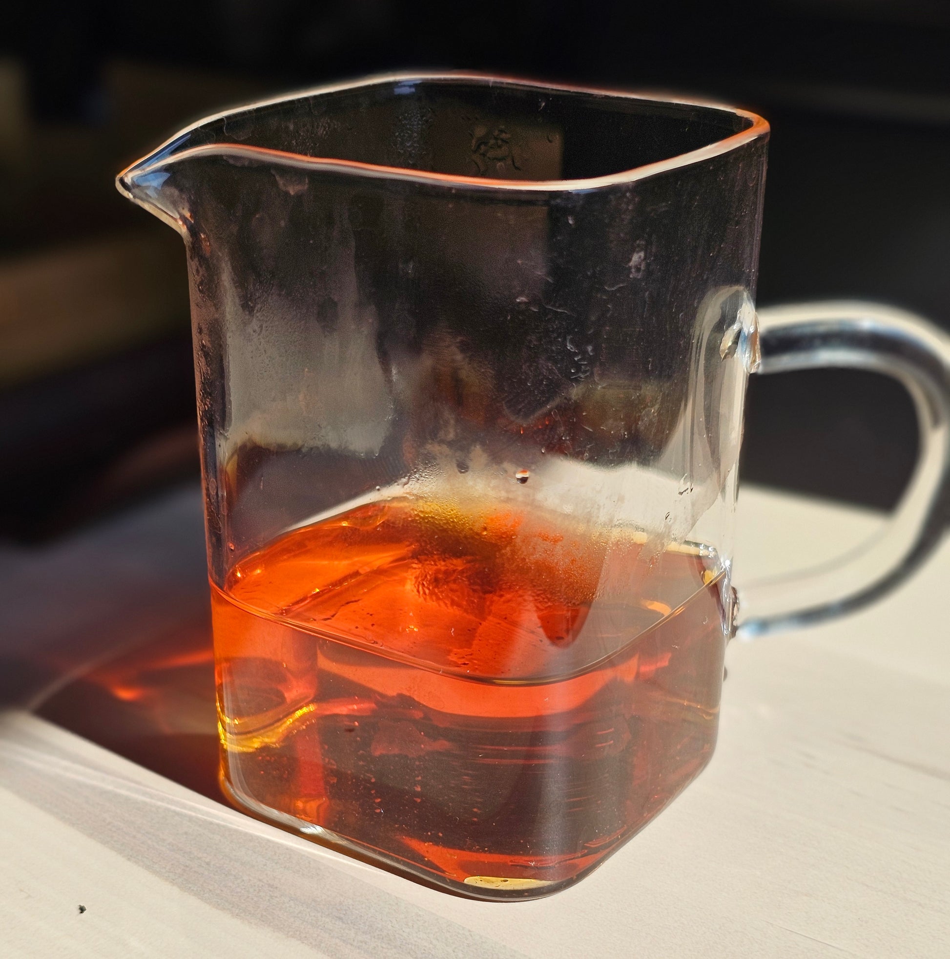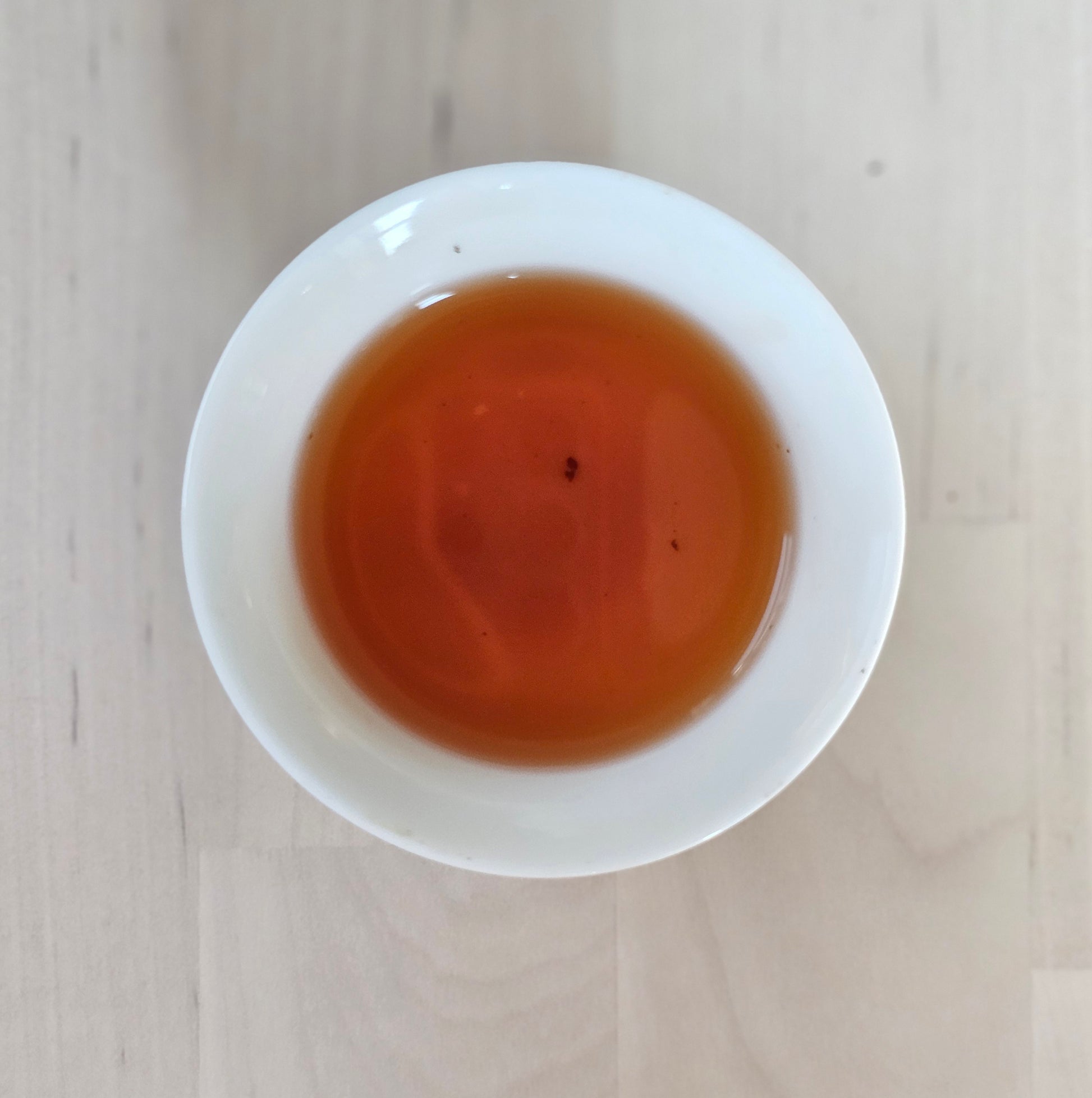The dry leaves of this tea give of the scent of sweet wood smoke, charcoal, bourbon, and chocolate. When they are warmed by the ceramic, the aroma shifts to that of roast coffee grounds, hot cocoa, and black pepper. We were reminded of the smell of Scholz Garten in Austin, a German smoked meats restaurant in downtown.