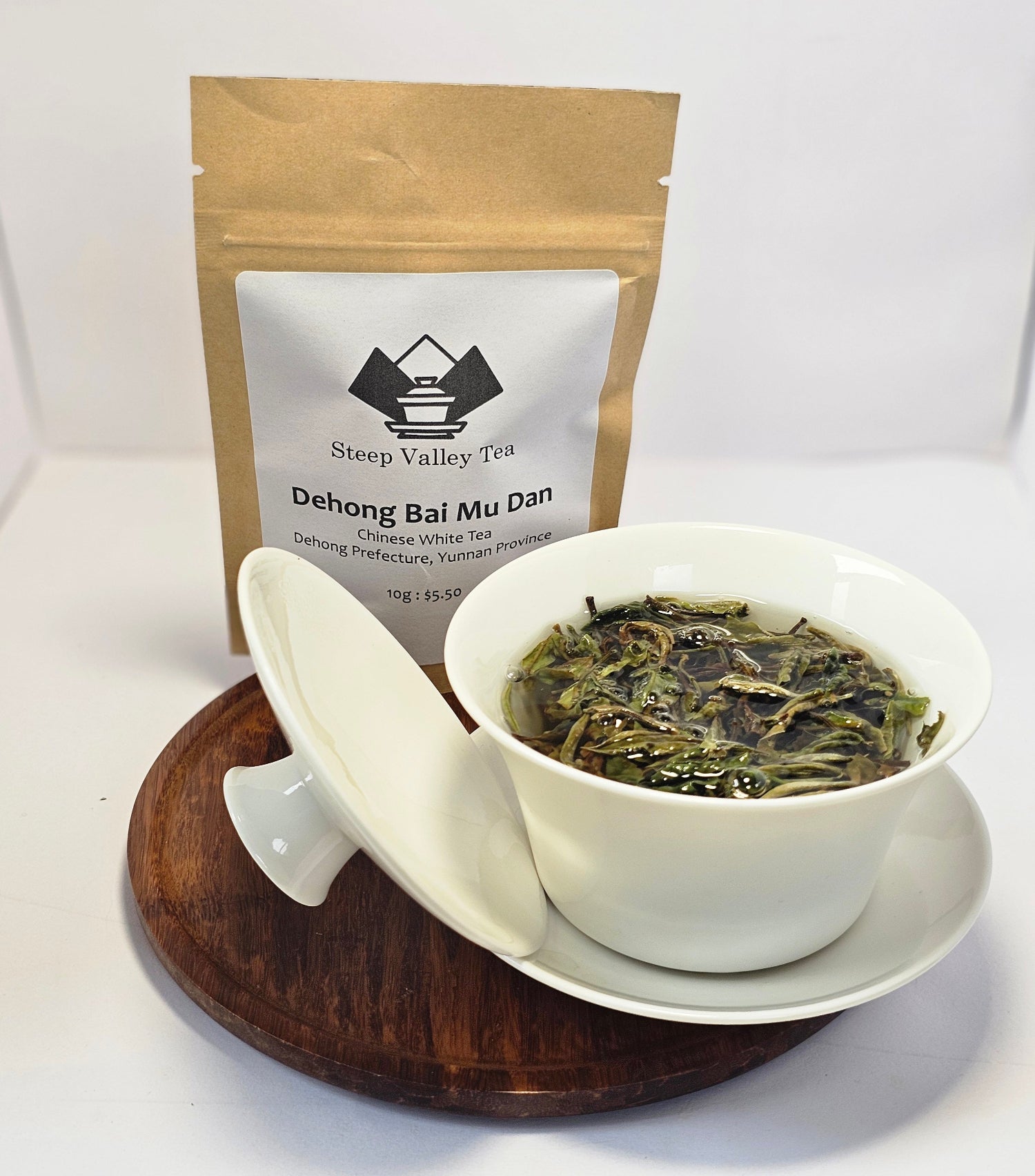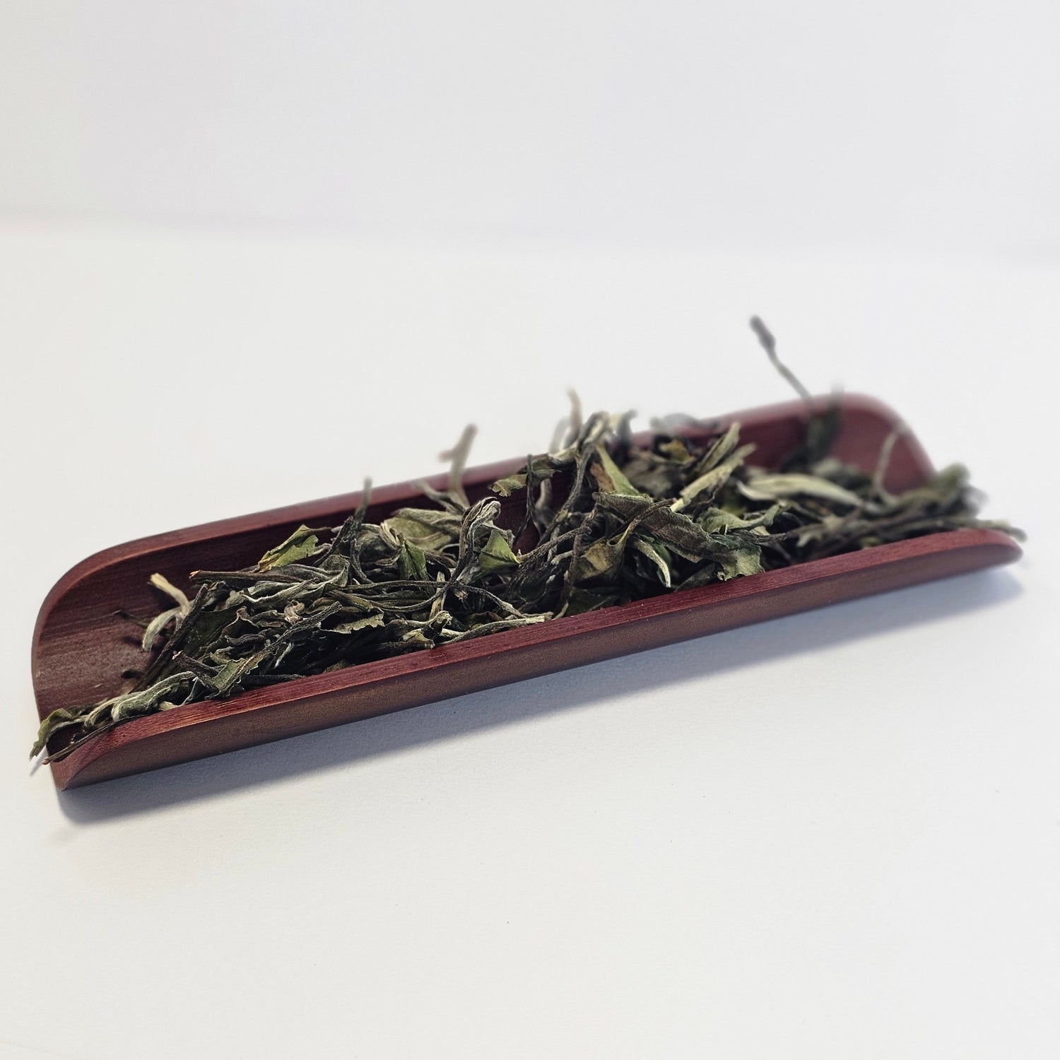 Bai Mu Dan ("White Peony") is a picking from the tea tree of the bud and two young leaves to be made into white tea. This particular tea comes from the Dehong Prefecture in southwest Yunnan, where the leaves are withered in the shade and air-dried.