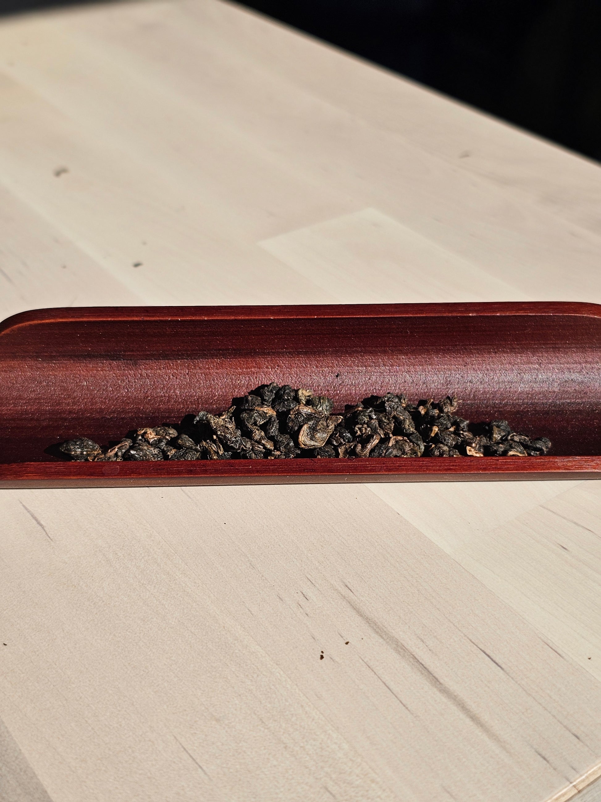 This tea has been beautifully roasted. The cold dry leaves give of an unassuming light minerality, but as soon as the ceramic warms the leaves, aromas of cocoa and warm toffee pour out from them. Smells of caramelized sugar warm the heart before you've even gotten the chance to drink the tea. While I first sampled this tea in the dog days of August, the smell fast-forwarded me to December, imagining myself walking in from the Pittsburgh winter to this smell filling a small café on the side of the street - hence its name.